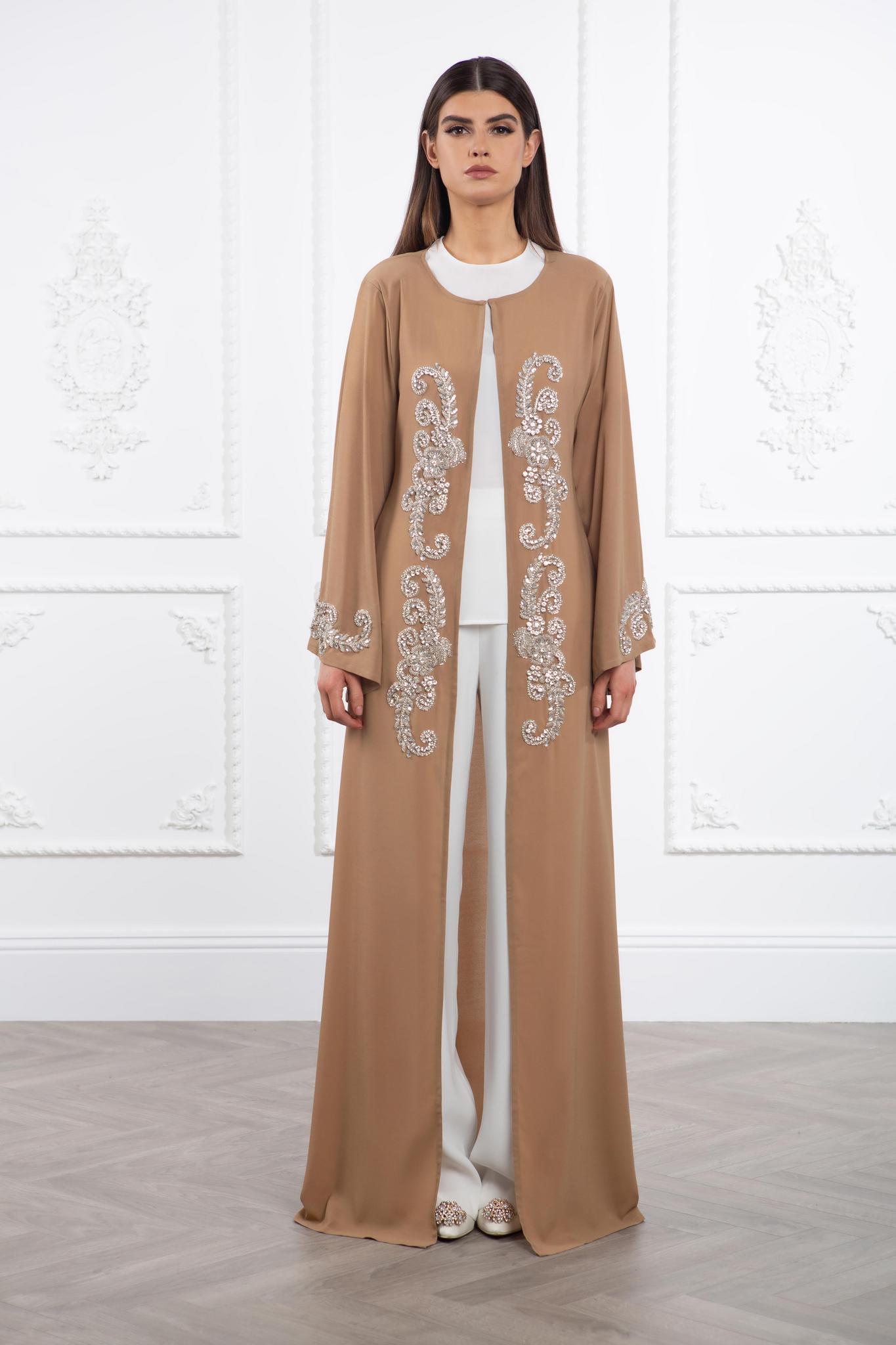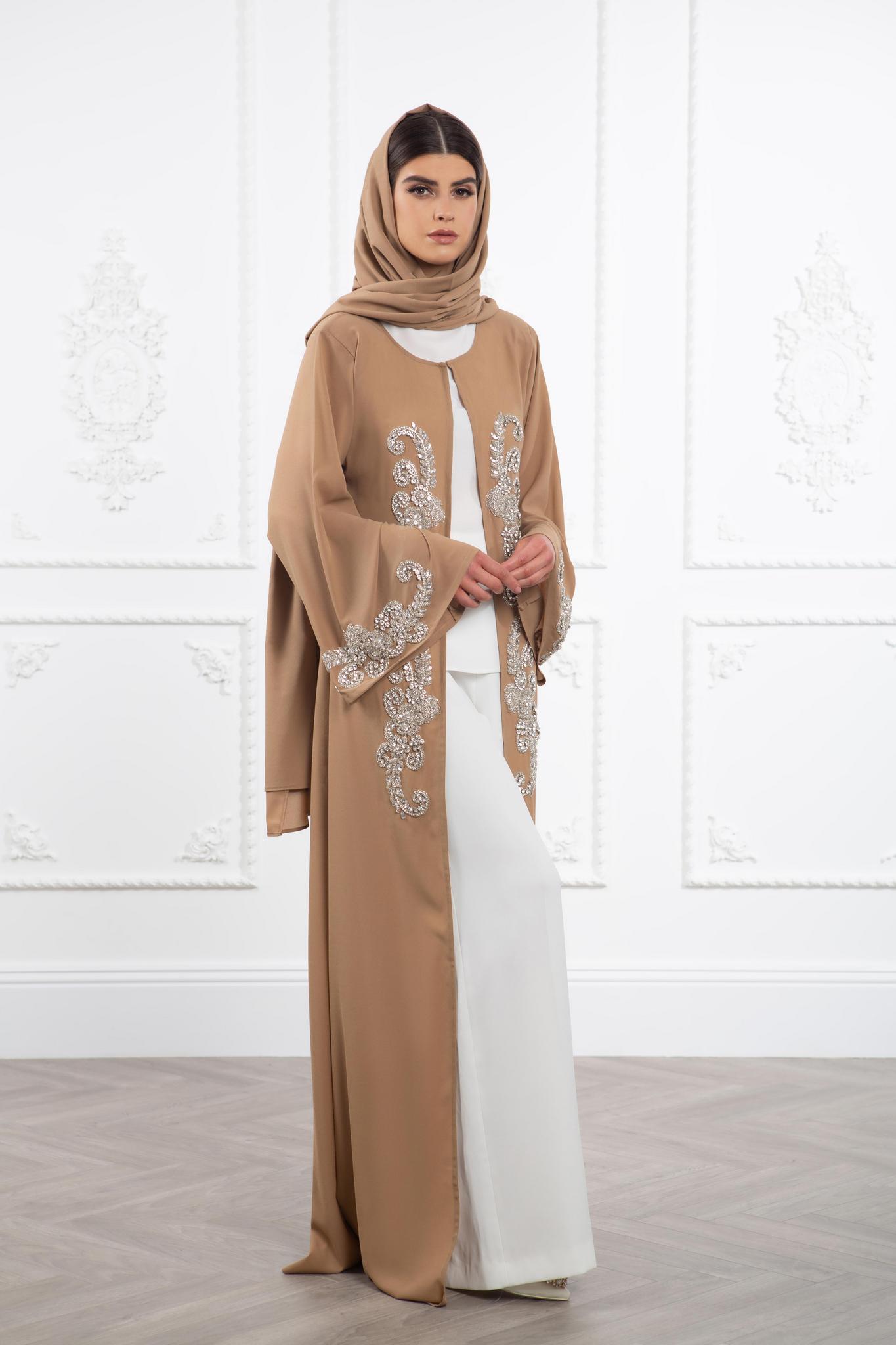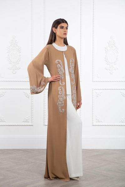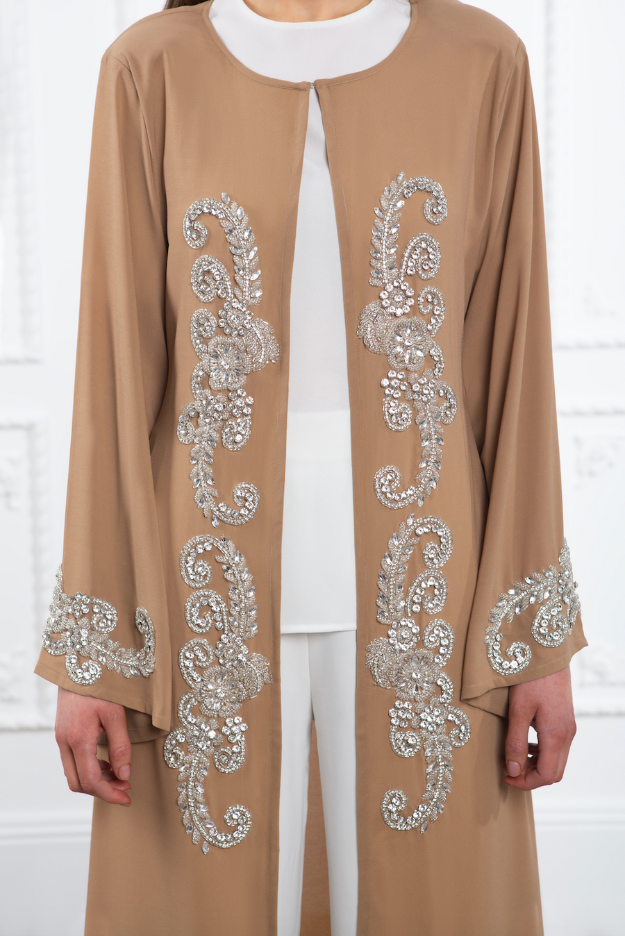 The abaya that is ideal for special occasions. Adorned with delicate crystal embellishments intricately crafted by hand, the abaya is made from flowing crepe and shaped to flow beautifully around the silhouette.