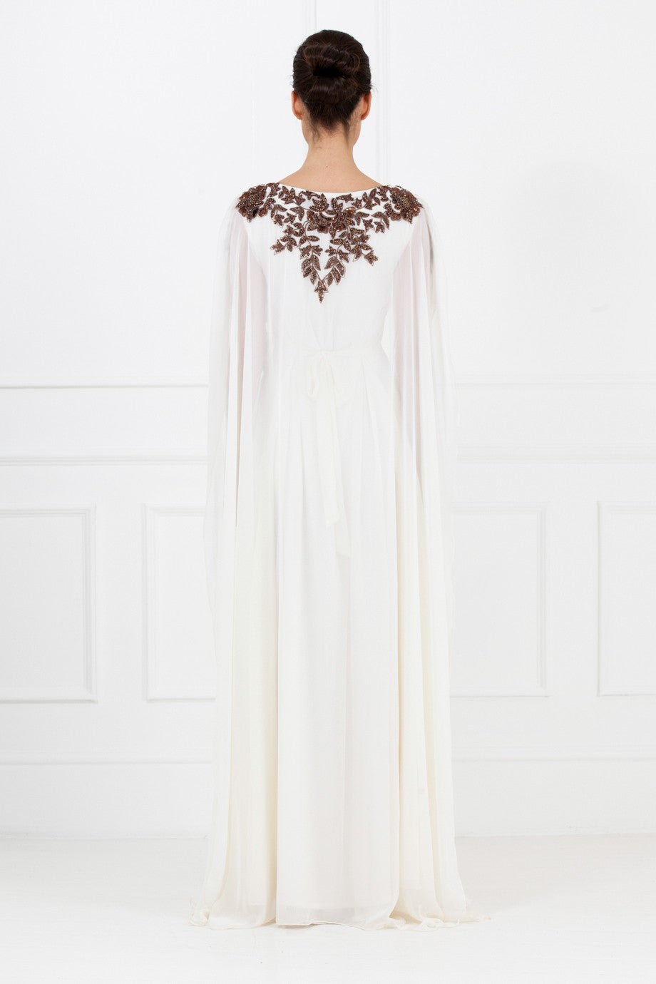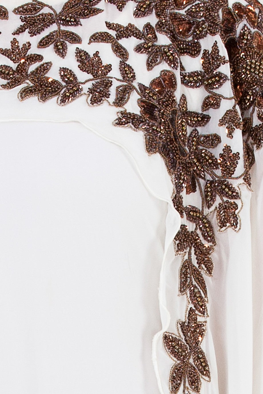Heavily embellished with leaf like arrangement of brown and bronze sequins. The waist tie can be adjusted for a more flattering look.