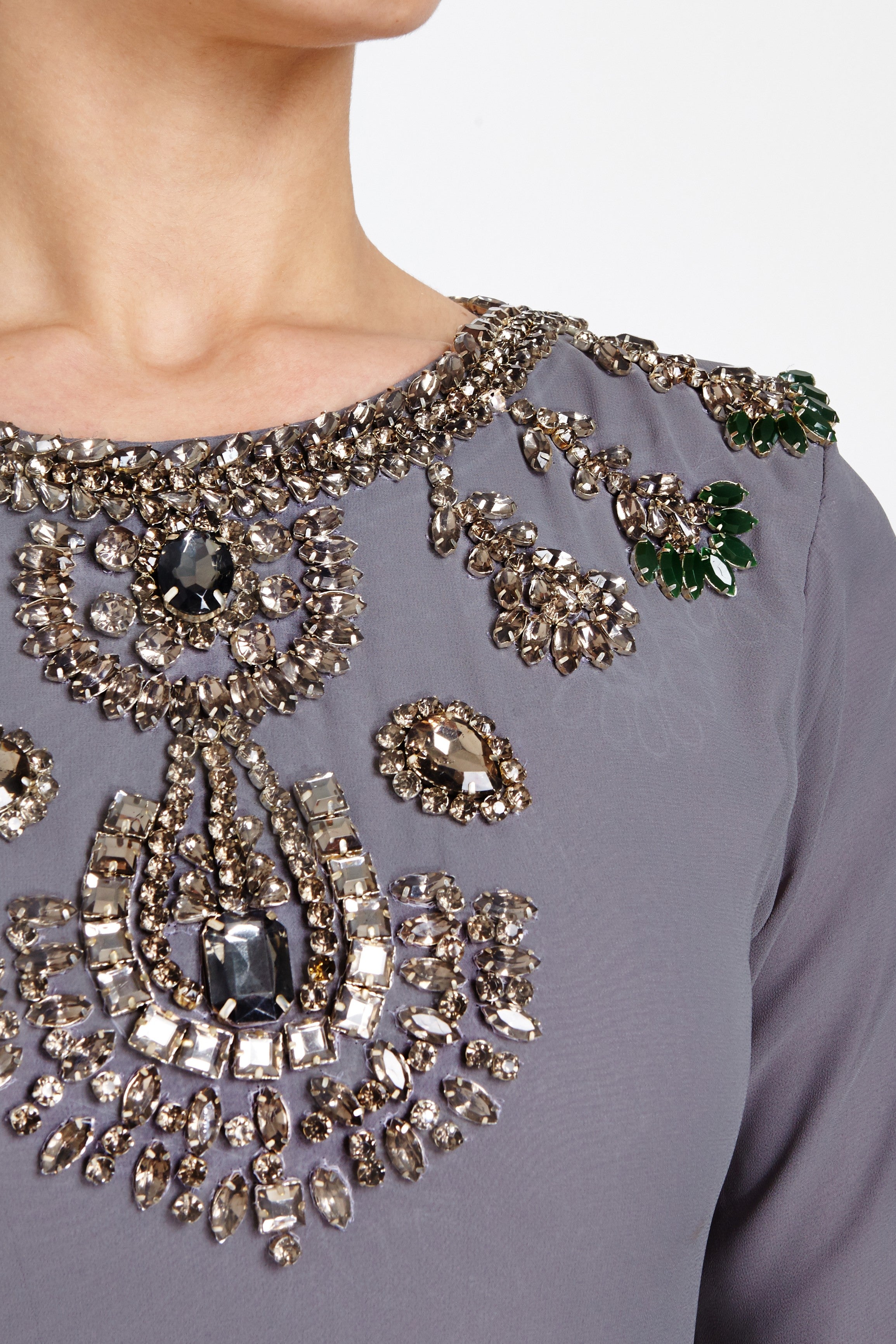 - Embellished with statement necklace