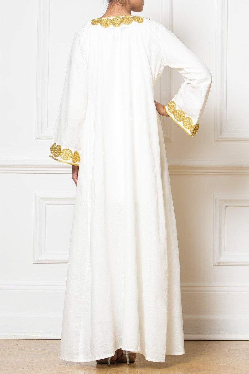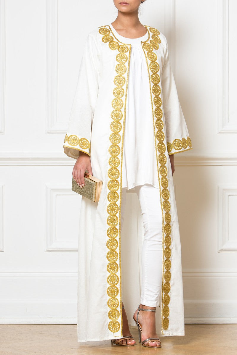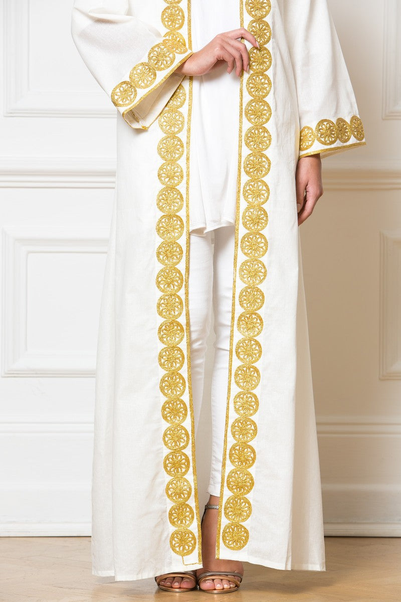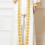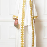 Go from day wear to evening dinner with our White/Gold Kimono. For your perfect outfit match it with a pair of jeans and a basic top and a pair of heels.