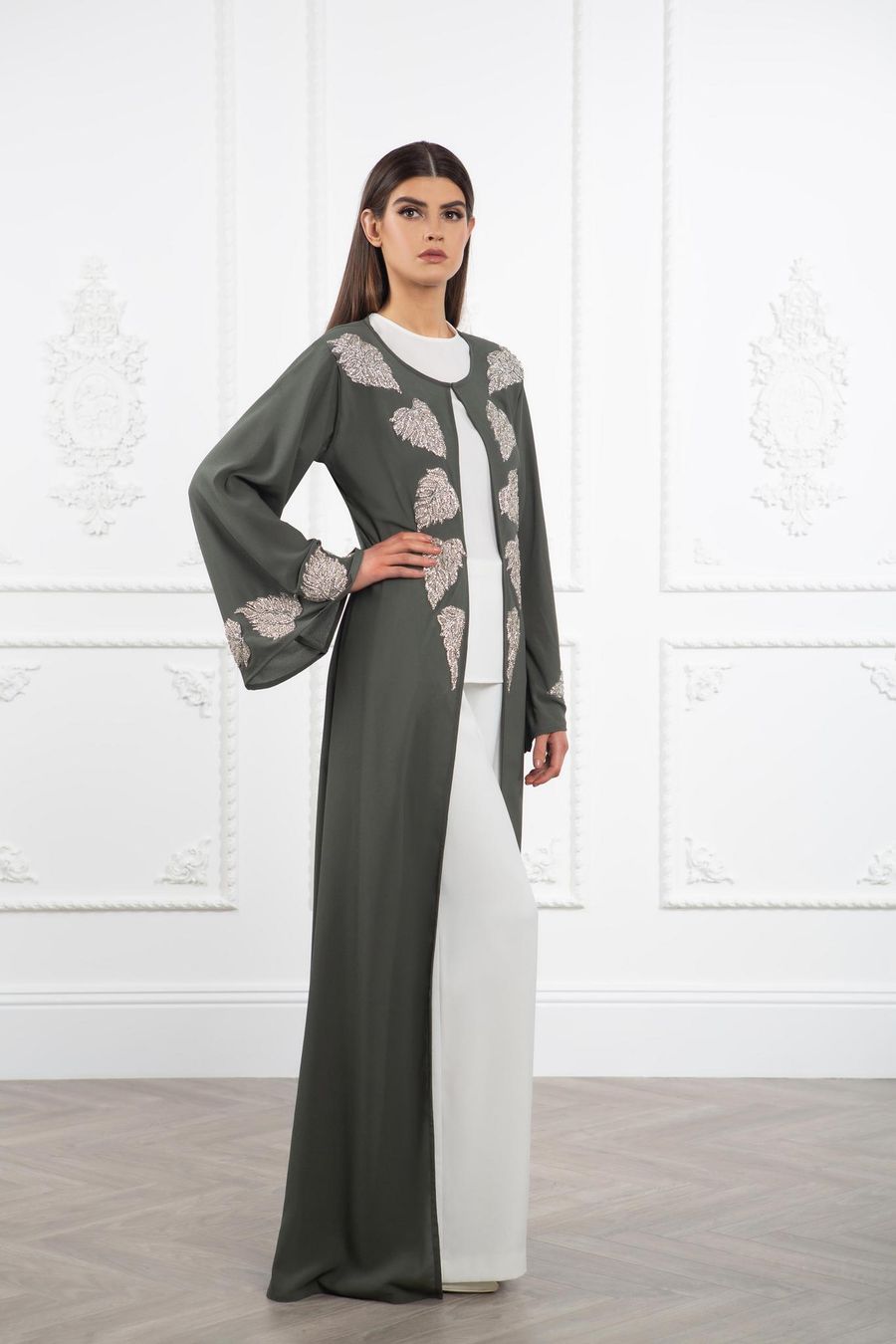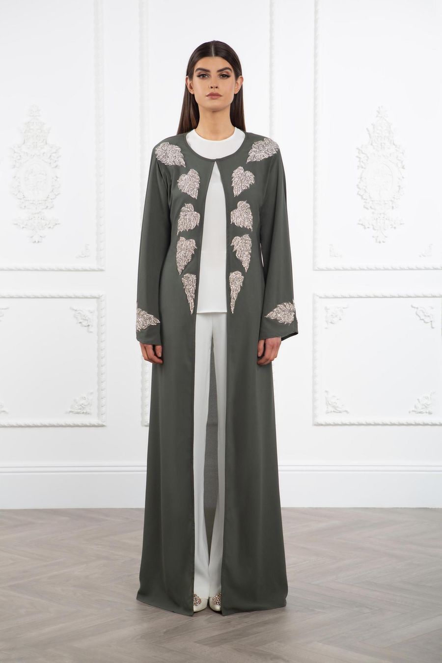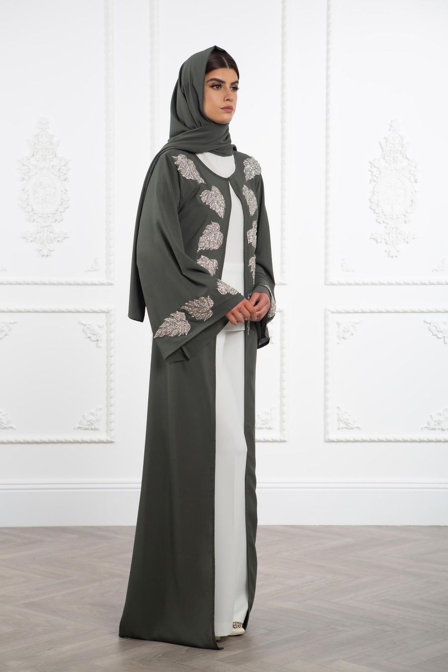 This exquisite abaya is adorned with exquisetly handcrafted crystal stonework on a rich textured fabric that drapes elegantly around your silhouette.
