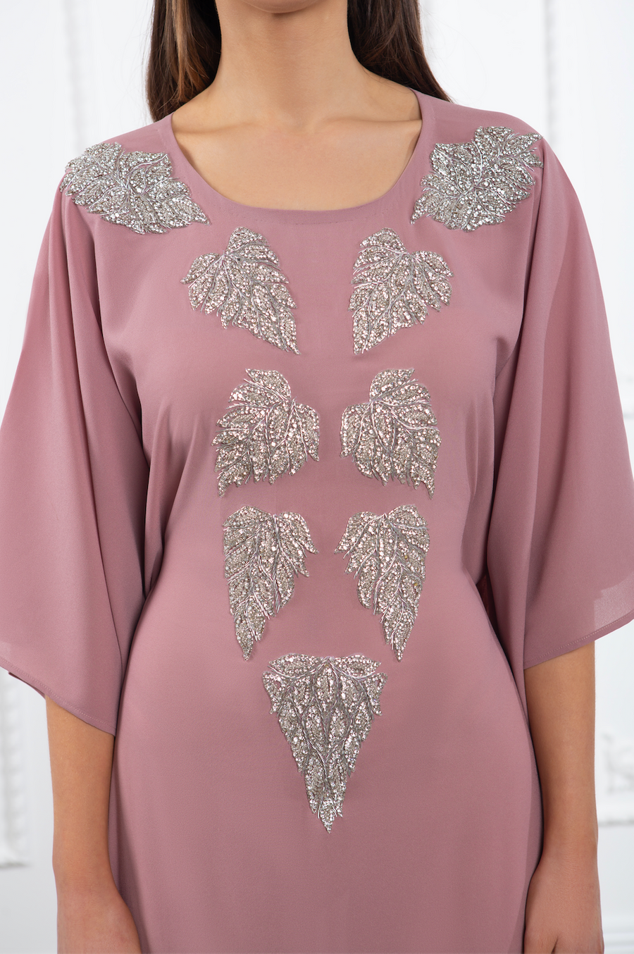This gorgeous kaftan is the perfect choice for your special occasions. The crêpe fabric drapes elegantly over your frame, while the hand crafted crystal and sequin details create a dazzling effect on the neckline. The slightly shorter sleeves allow you to accessorise with your favourite bracelets and complete your glamorous look.