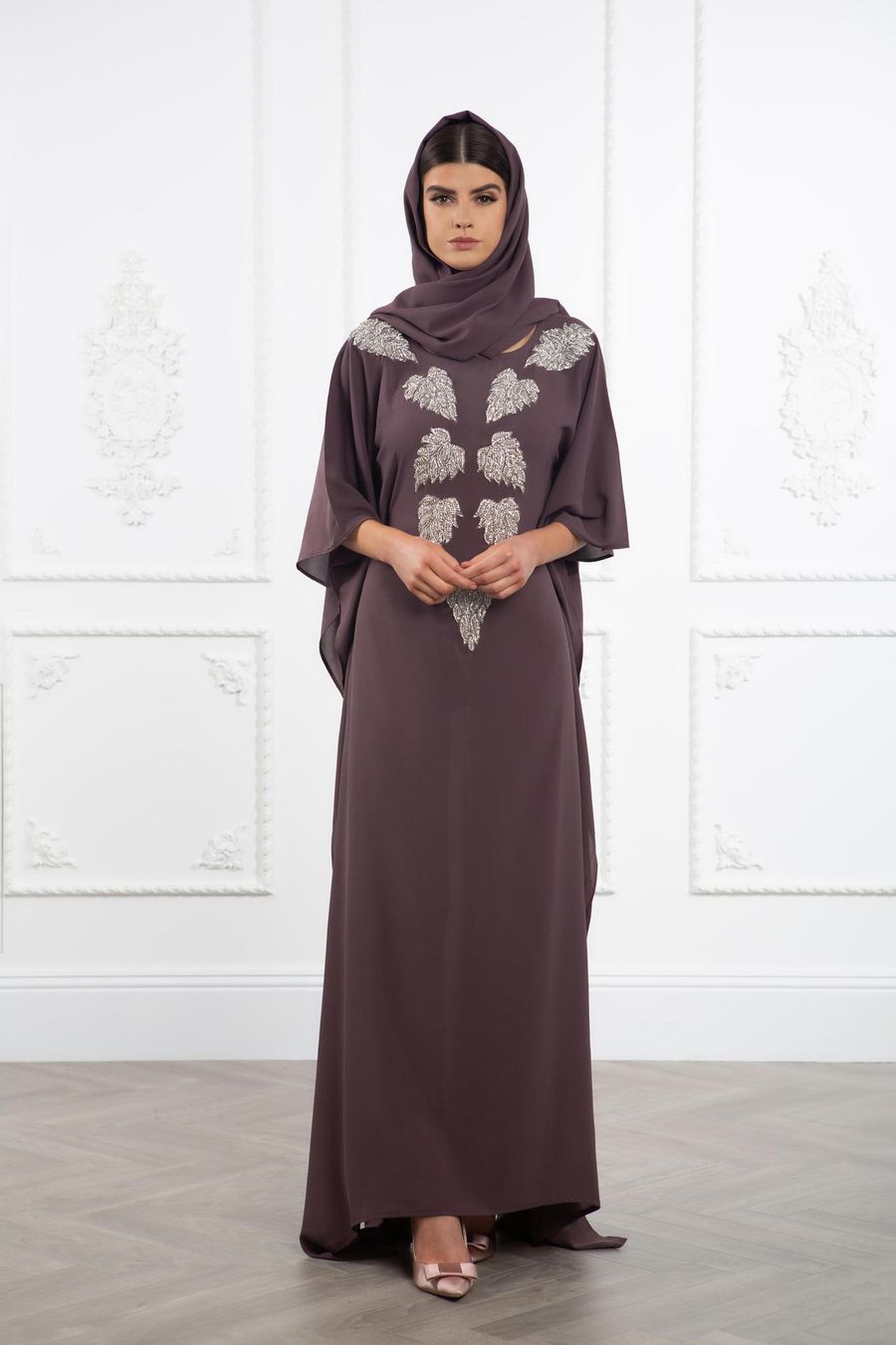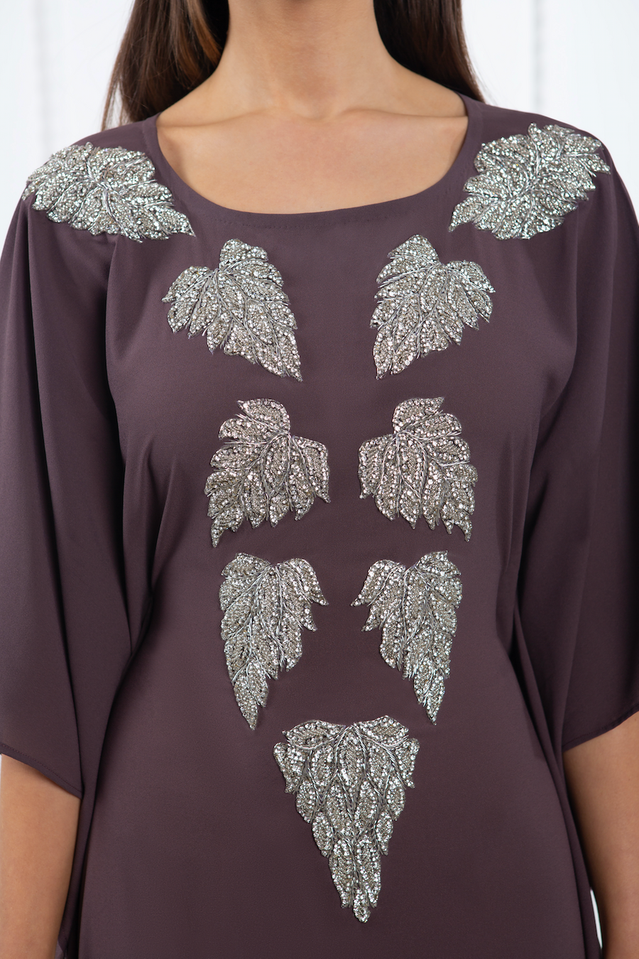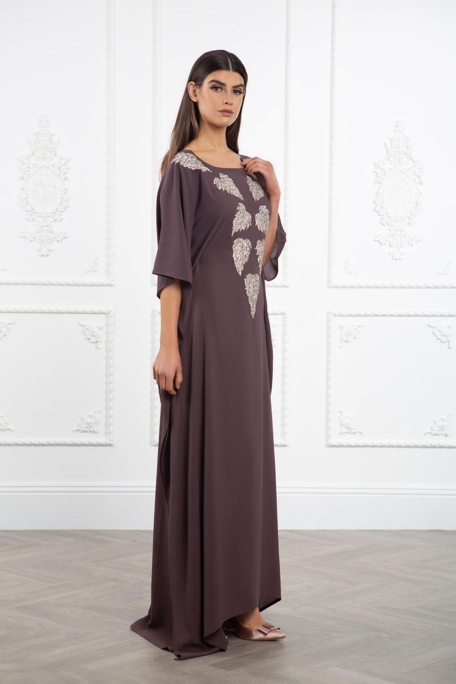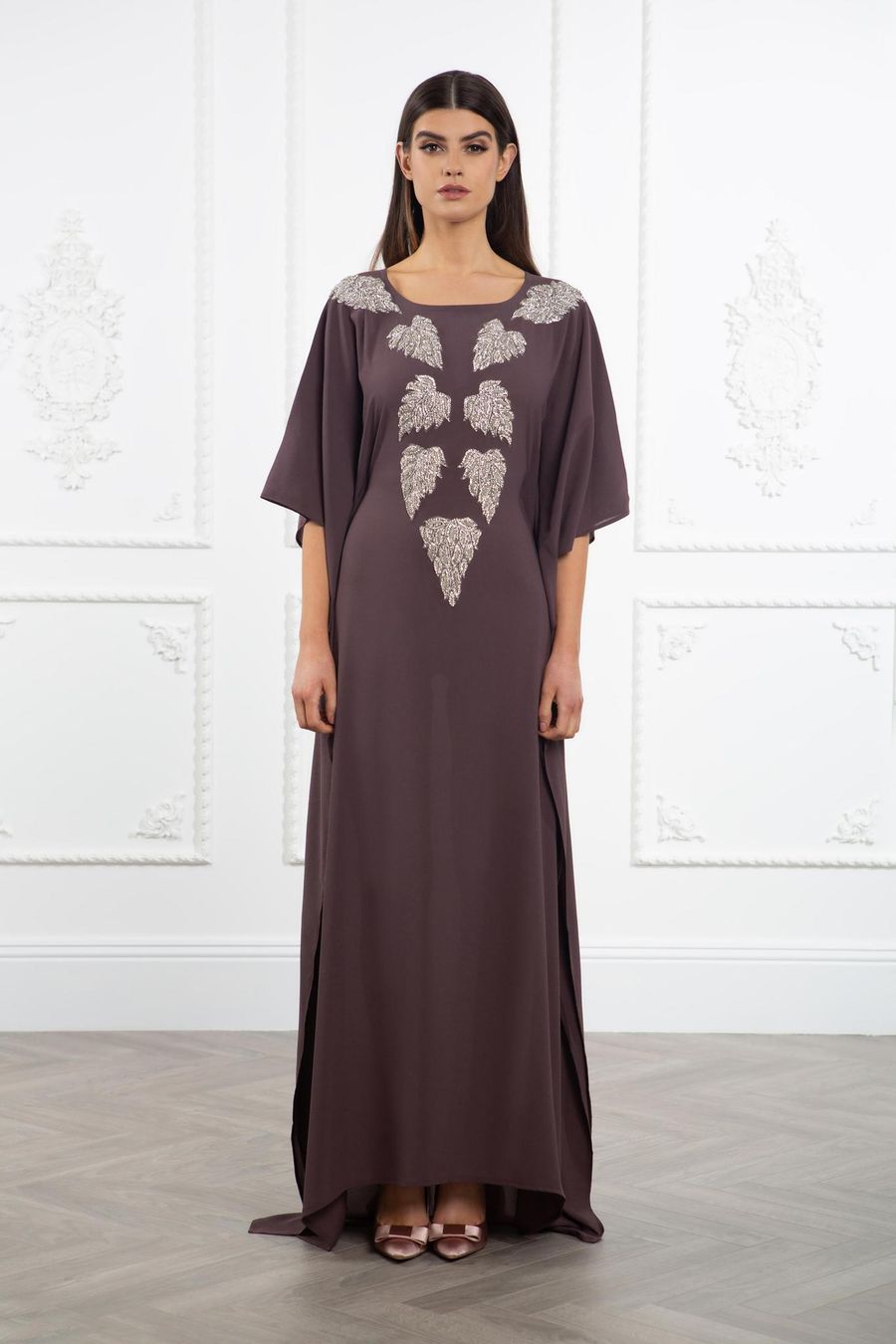 This gorgeous kaftan is the perfect choice for your special occasions. The crêpe fabric drapes elegantly over your frame, while the hand crafted crystal and sequin details create a dazzling effect on the neckline. The slightly shorter sleeves allow you to accessorise with your favourite bracelets and complete your glamorous look.