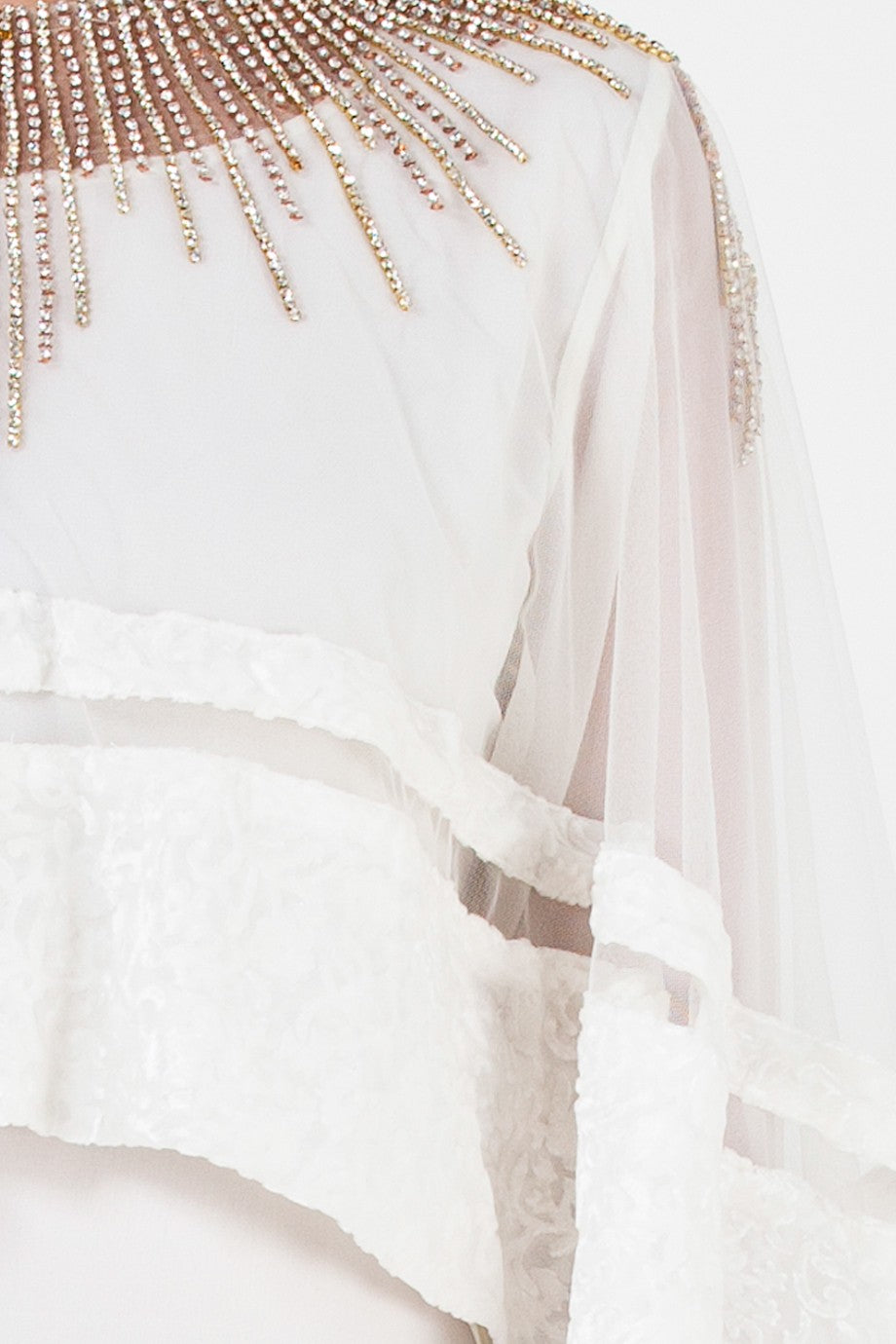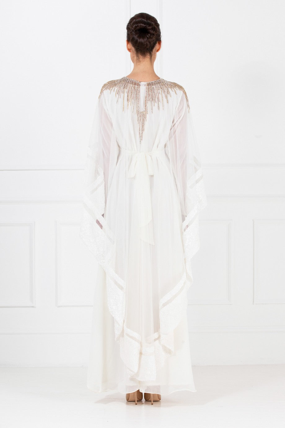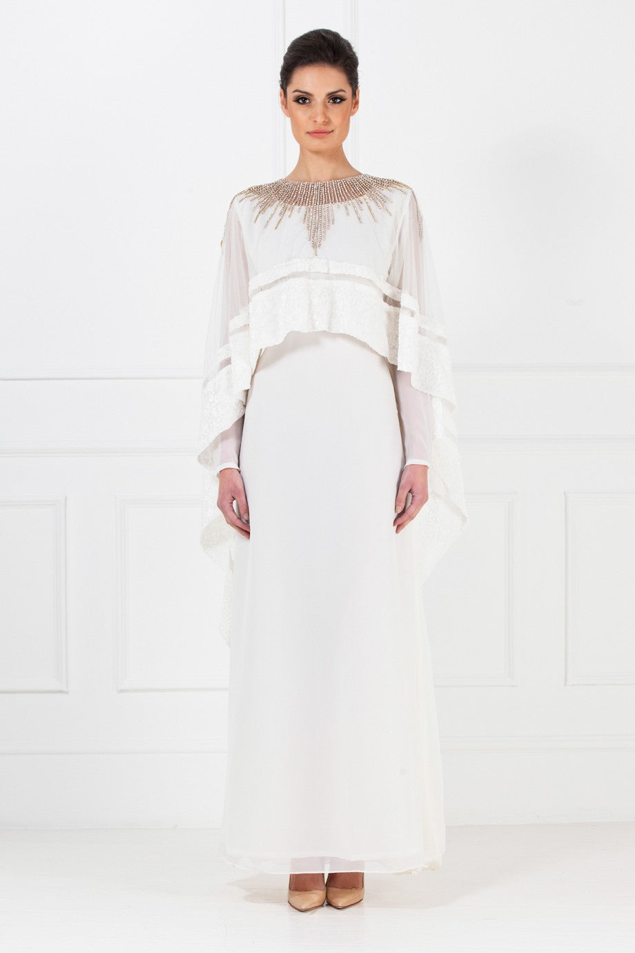 This gown is made with white chiffon fabric and crystals. The embellishment have been carefully placed around the neckline for a more accentuated look. It also comes with a cape, concealed buttoning at the back and finished with an adjustable belt.